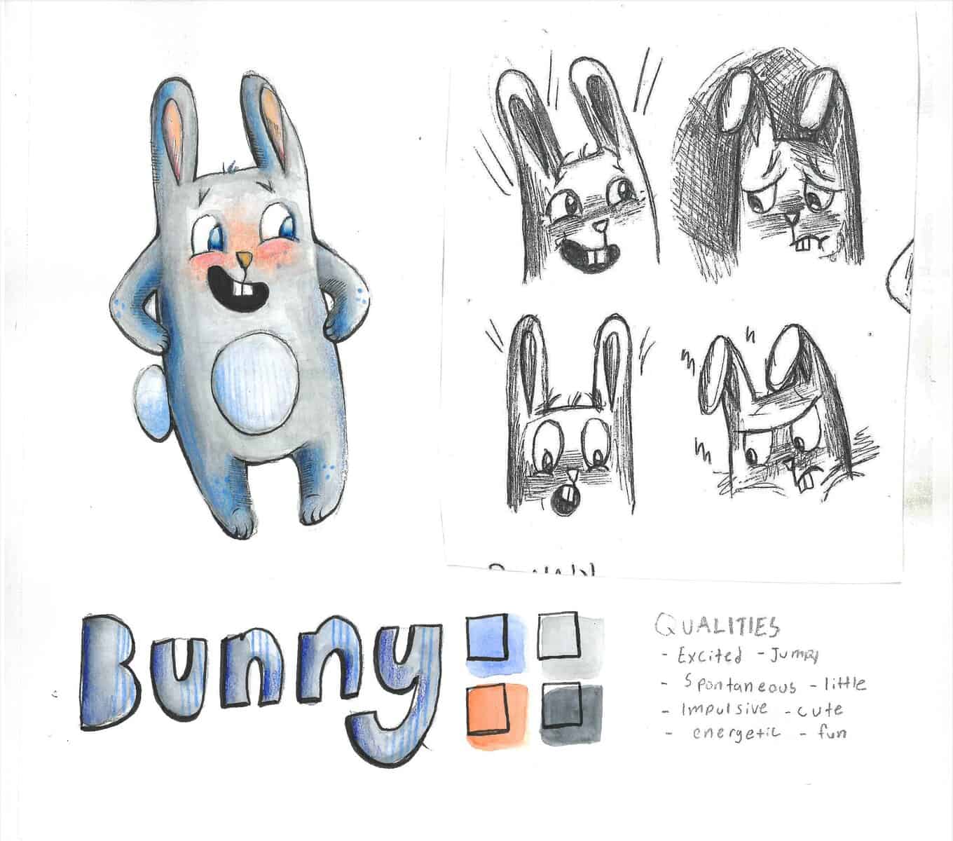 Here are examples of the first sketches showing various emotions that I put together when imagining the characters: